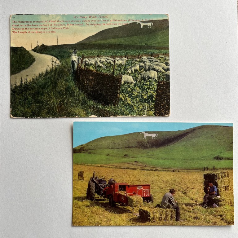 Here’s an example: two postcards I found in a collector’s shop in Salisbury, taken in different time periods, but both showing the unmistakeable outline of the Westbury White Horse: